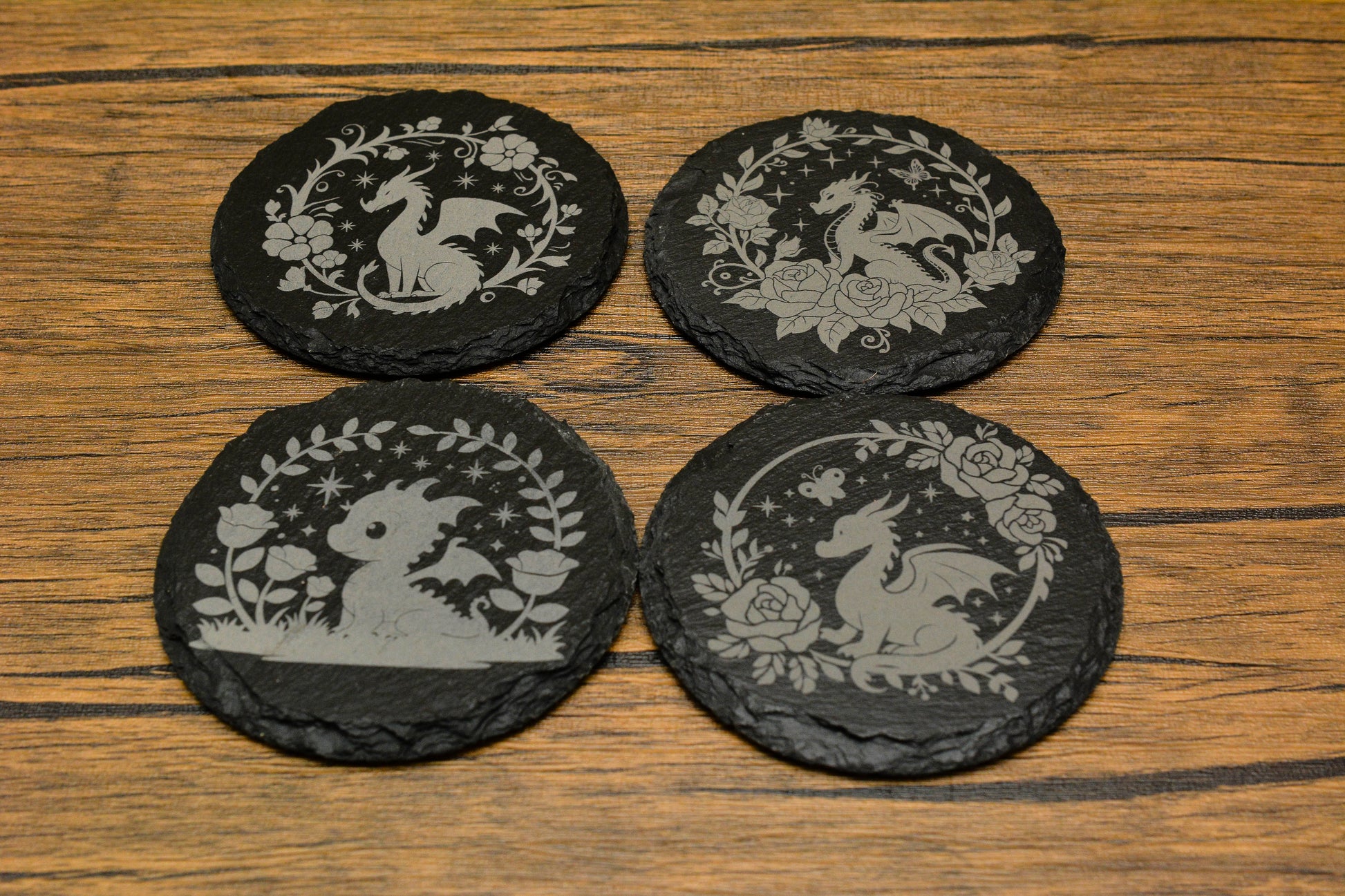 A spark of soft magic captured in stone. This engraved slate coaster features a sweet dragon nestled among flowers and stars, blending gentle fantasy with everyday practicality. Ideal for dreamers, tea lovers, and those who see wonder in the smallest details.