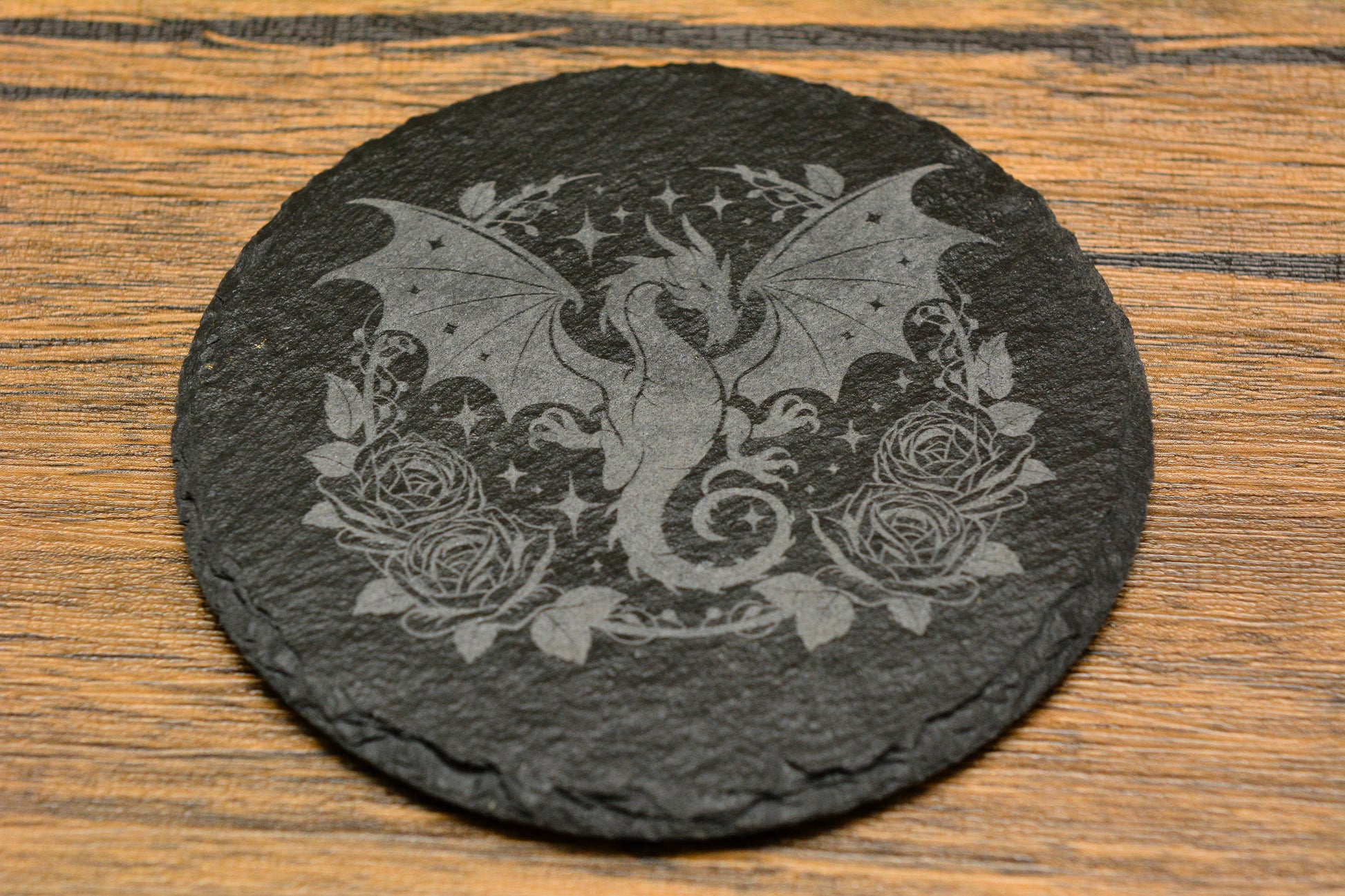 Engraved Slate Dragon Coaster – Natural Edge Drink Mat (Round or Square)