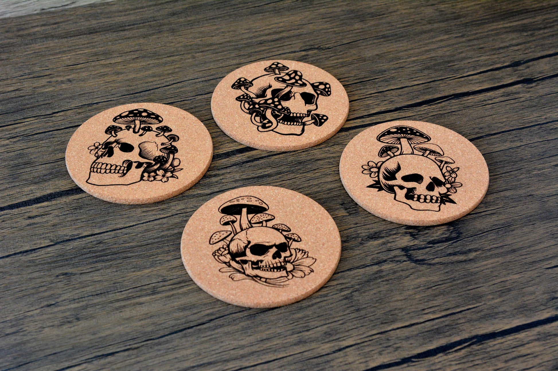 This gothic cork coaster features a laser engraved skull design entwined with wild mushrooms, inspired by shadowed forests, folklore symbolism, and dark natural themes.