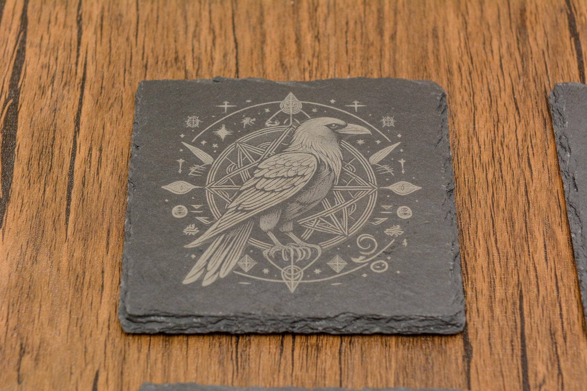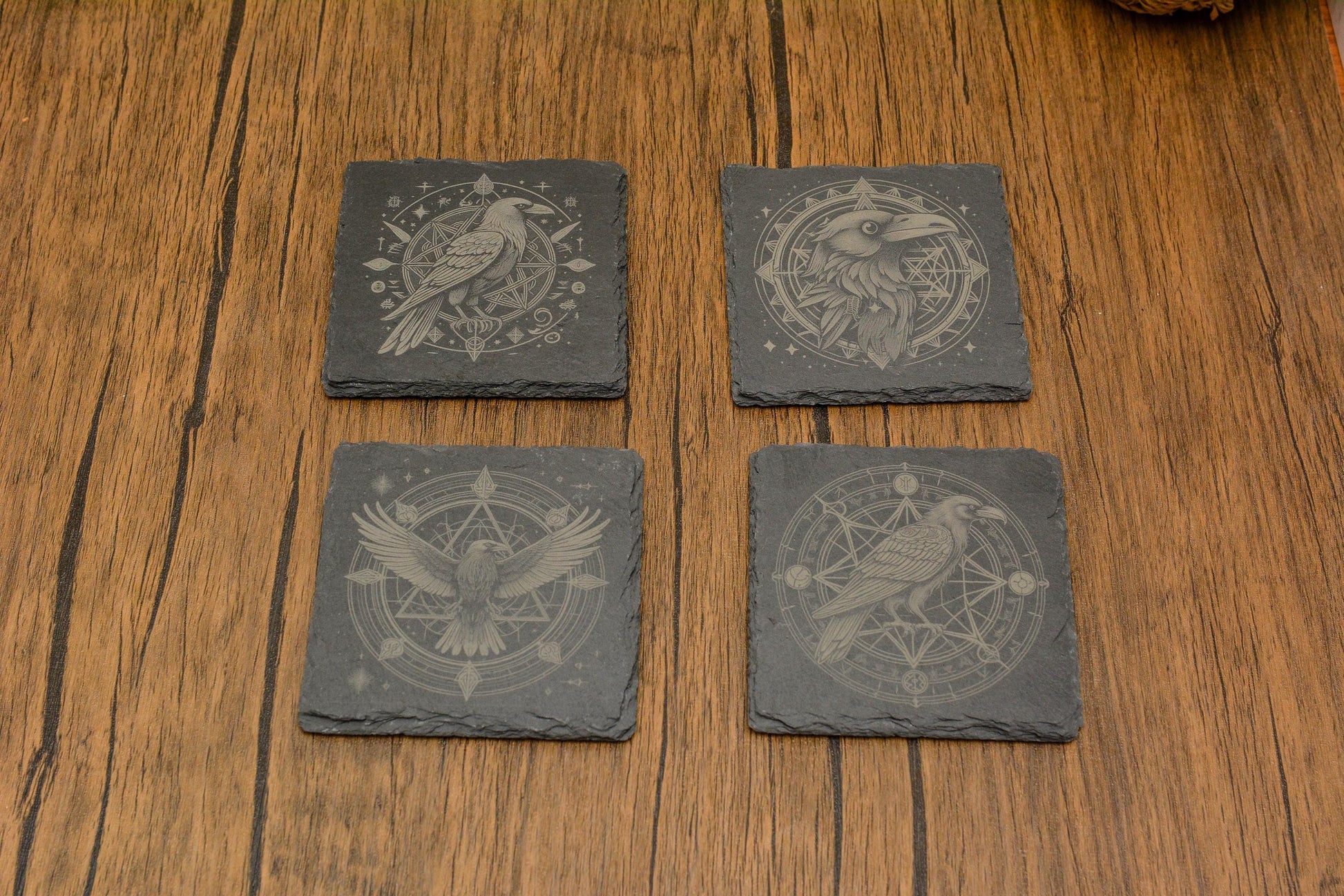 Add a touch of natural elegance to your home with our beautifully handcrafted slate coasters featuring intricate raven designs.