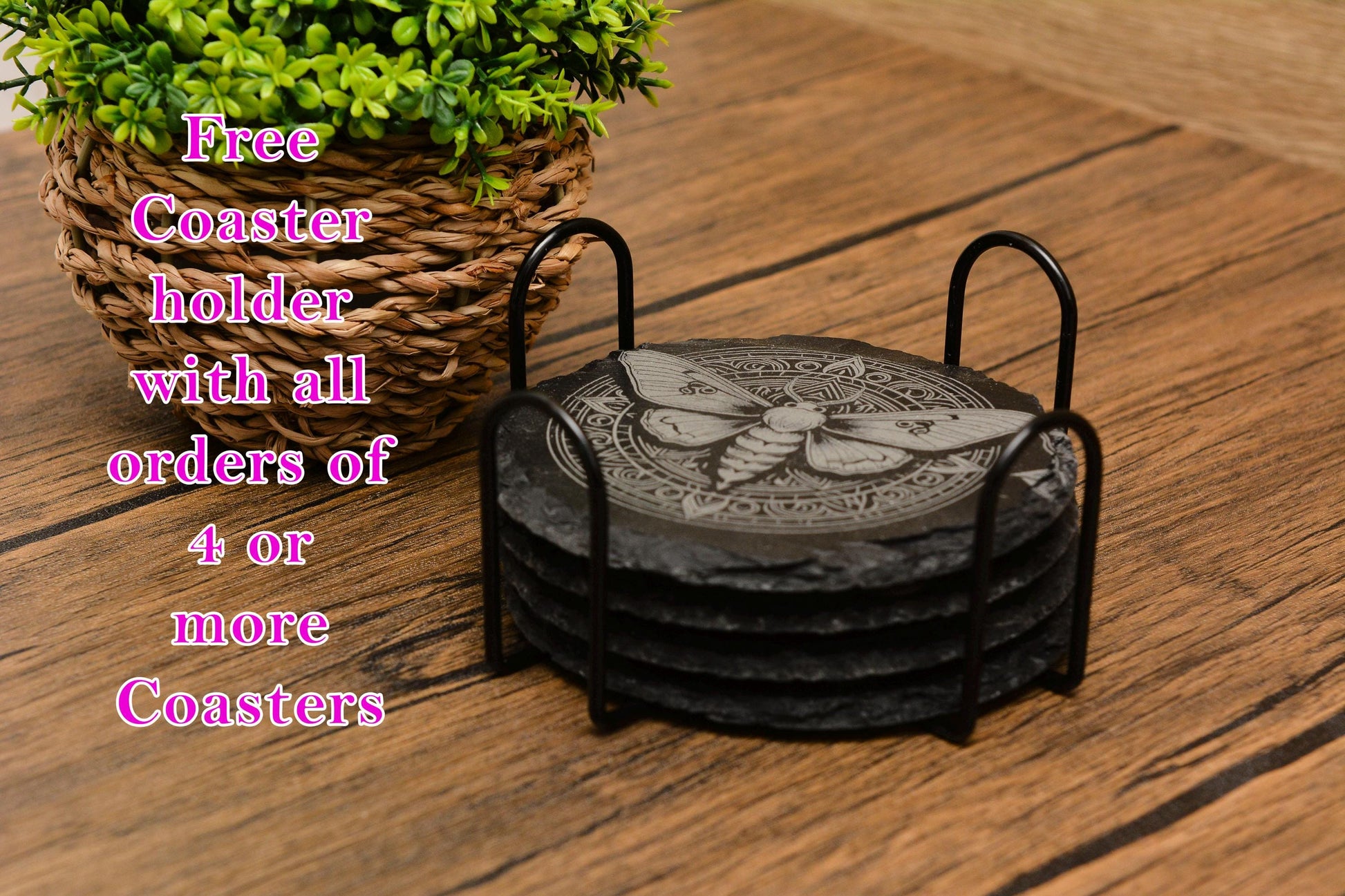 Order 4 or more slate coasters and we’ll include a coaster holder on the house – because your altar (or coffee table) deserves to look as magical as you.