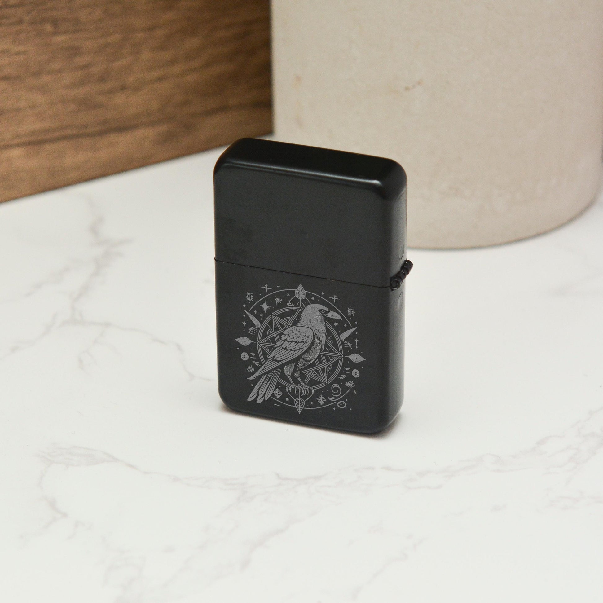 Norse Raven Engraved Stainless Steel Lighter – Gothic Bird Design, Witchy Gift, Refillable Black Matte Lighter for Whimsical Decor