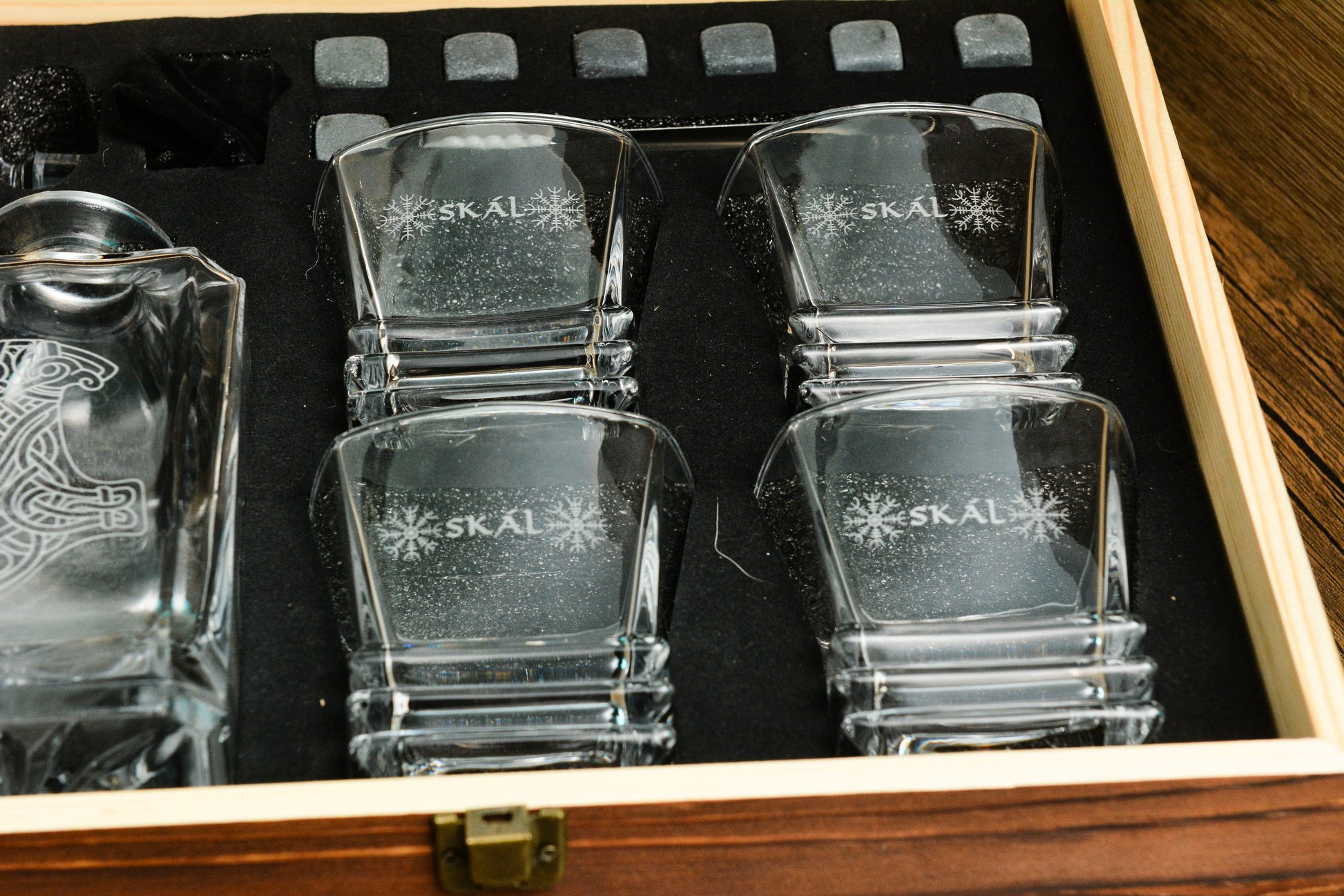 This Norse-inspired whisky set brings strength, tradition, and a touch of myth to every pour. Featuring a decanter engraved with Thor’s mighty hammer and four matching glasses etched with SKÅL — the ancient Nordic word for “cheers” — this set is the perfect centrepiece for feasts, gifts, and gatherings.