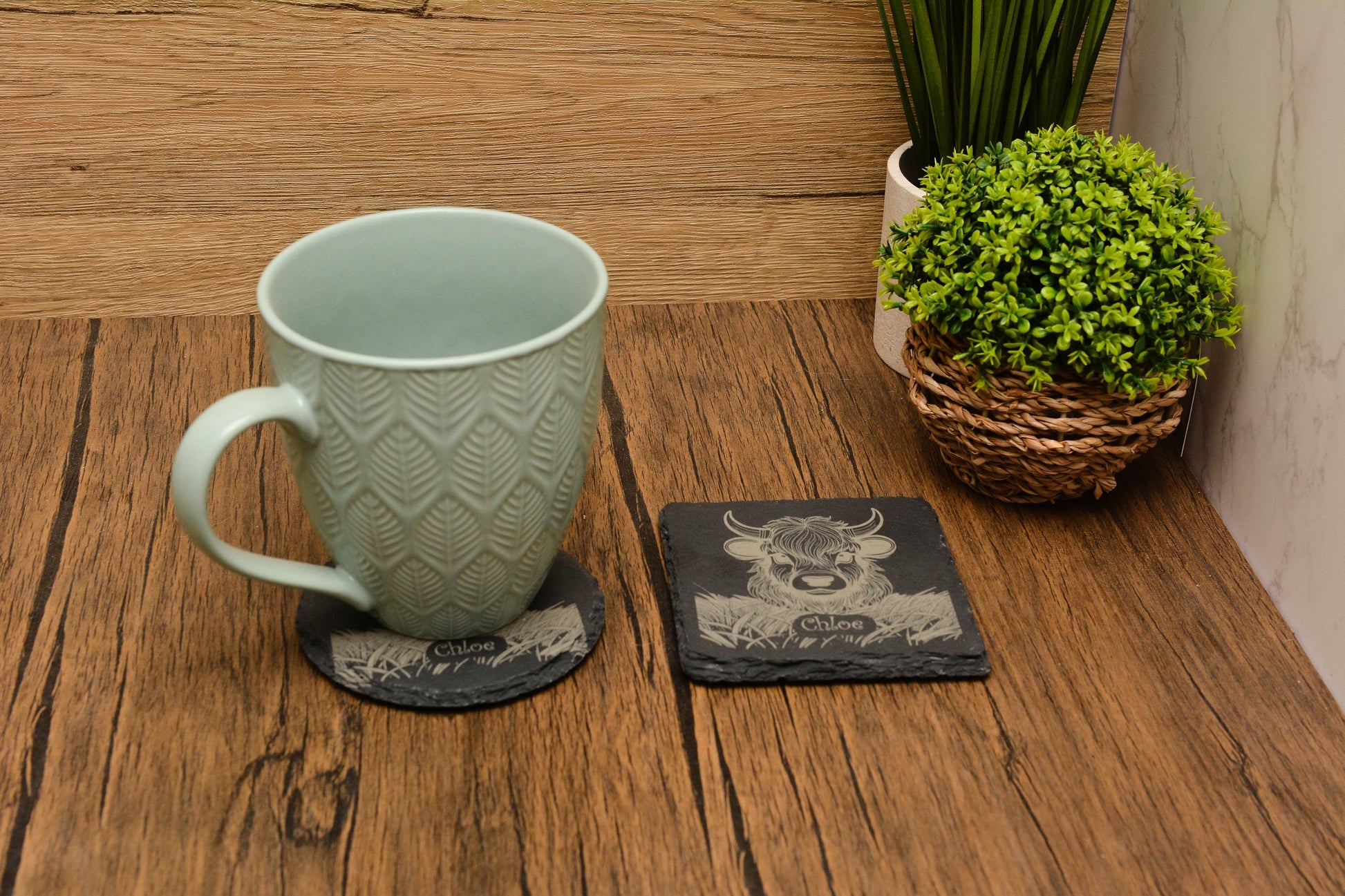 Add a touch of the countryside to your home with our personalised Highland Cow Slate Coasters. Featuring a finely detailed engraving of a Highland cow, each coaster includes space beneath the design for your custom name or message – making it both a practical and thoughtful addition to any space.