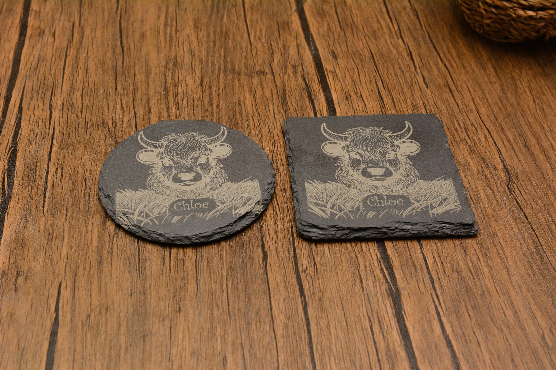Personalised Highland Cow Slate Coaster Custom Engraved Name, Cute Stone Coaster, Farmhouse Rustic Decor, Highland Cattle Gift for Cow Lover